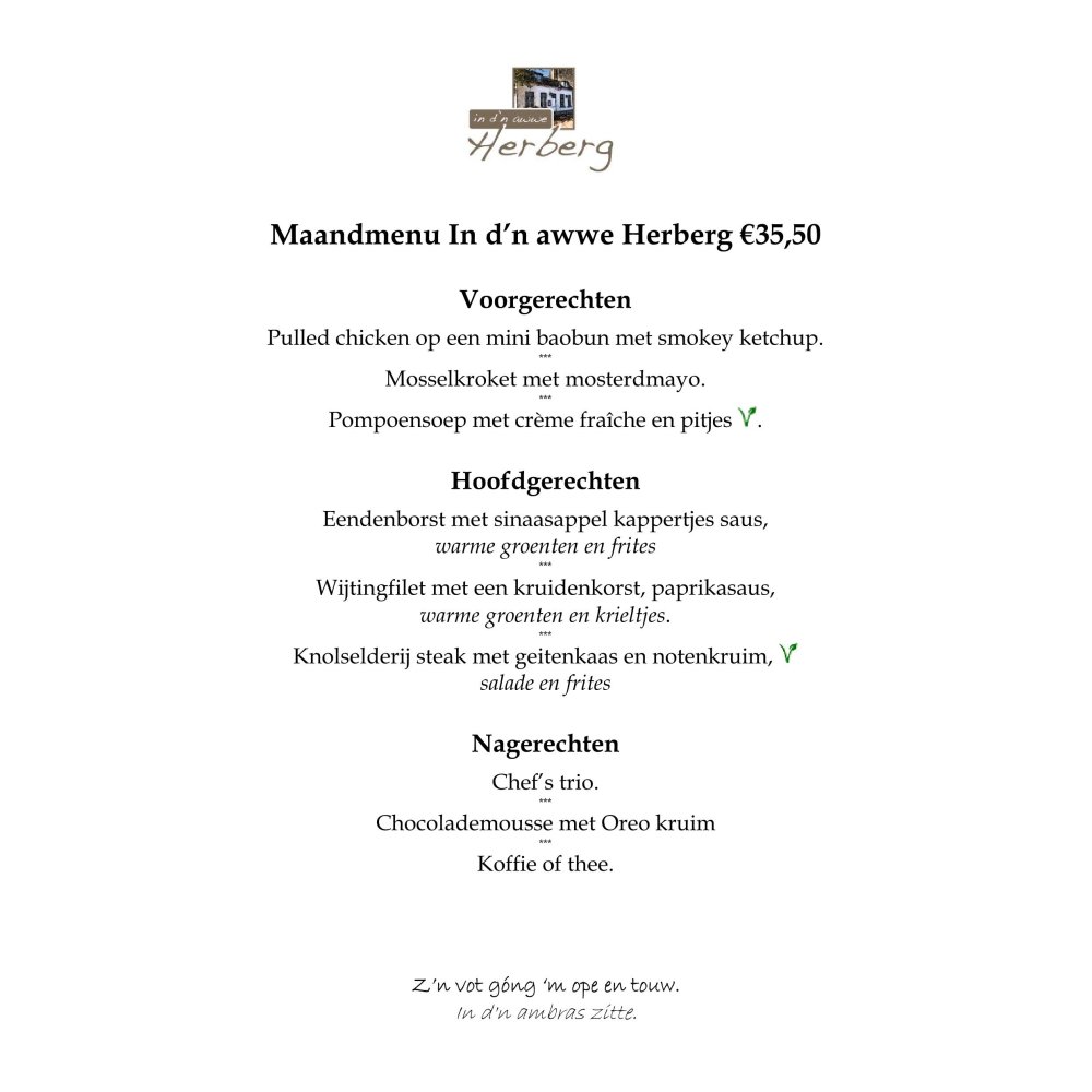 Maandmenu oktober €35,50 29 september - 3 november In d'n awwe Herberg Maandmenu oktober Lees verder VoorgerechtenPulled chicken op een mini baobun met smokey ketchup.***Mosselkroket met mosterdmayo.***Pompoensoep met crème fraîche en pitjes .HoofdgerechtenEendenborst met sinaasappel kappertjes saus,warme groenten en frites***Wijtingfilet met een kruidenkorst, paprikasaus,warme groenten en krieltjes.***Knolselderij steak met geitenkaas en notenkruim, salade en fritesNagerechtenChef’s trio.***Chocolademousse met Oreo kruim***Koffie of thee. Papenweg 34, 6212 CG Maastricht